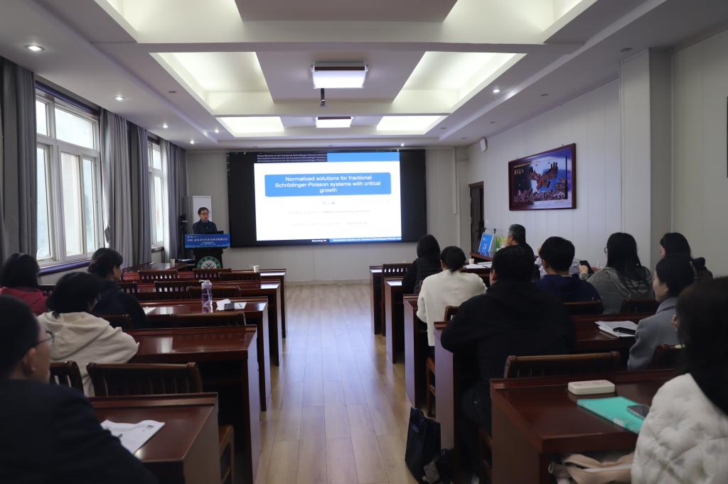 报告中贺教授首先介绍了分数阶Schr\”{o}dinger-Poisson系统的背景及最新进展,接着介绍了无预定$L^2$范数的分数阶Schr\”{o}dinger-Poisson系统的若干结果,最后分别介绍了具有临界非局部项和具有Sobolev临界增长的分数阶Schr\”{o}dinger-Poisson系统的规范化解的相关结果及其证明过程。
