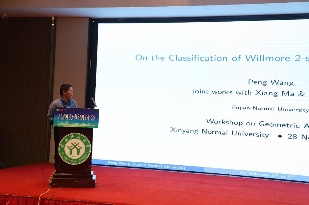 第三场报告中,福建师范大学王鹏教授作了题为《On the classification of Willmore 2-spheres in the n-sphere》的学术报告,由中国科学院大学焦晓祥教授主持。王教授在报告中完整分类了所有Willmore二维球面,将其分为三类:(1)满足“法向水平”条件的特殊扭量曲线投影;(2)具平面末端的严格m-各向同性Rn空间极小曲面;(3)由特定严格m-各向同性极小曲面经(m−k)步伴随变换导出的严格k-各向同性Willmore球面。